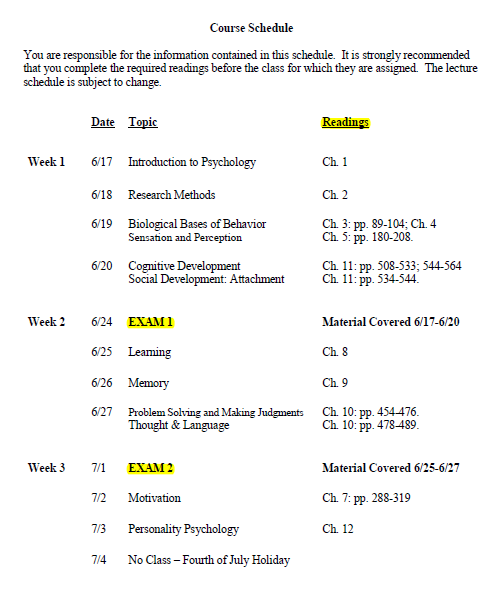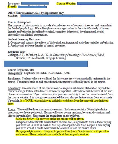 I have highlighted some of the key things one should look for on the syllabus below. Notice how the professor underlines, capitalizes, and uses bold print for what is important for her students to do and WHEN they should do it.